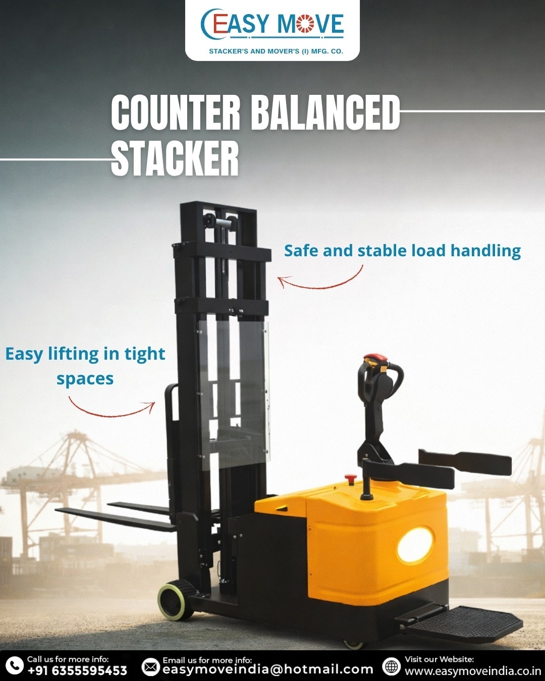 EasyMove is a trusted Counter balance Stacker Manufacturer in Ahmedabad, offering advanced material handling solutions for warehouses, factories, retail stores, and logistics centers. Our counterbalance stackers are designed to lift, move, and stack loads efficiently without front support legs, making them ideal for closed-bottom pallets and confined working areas.