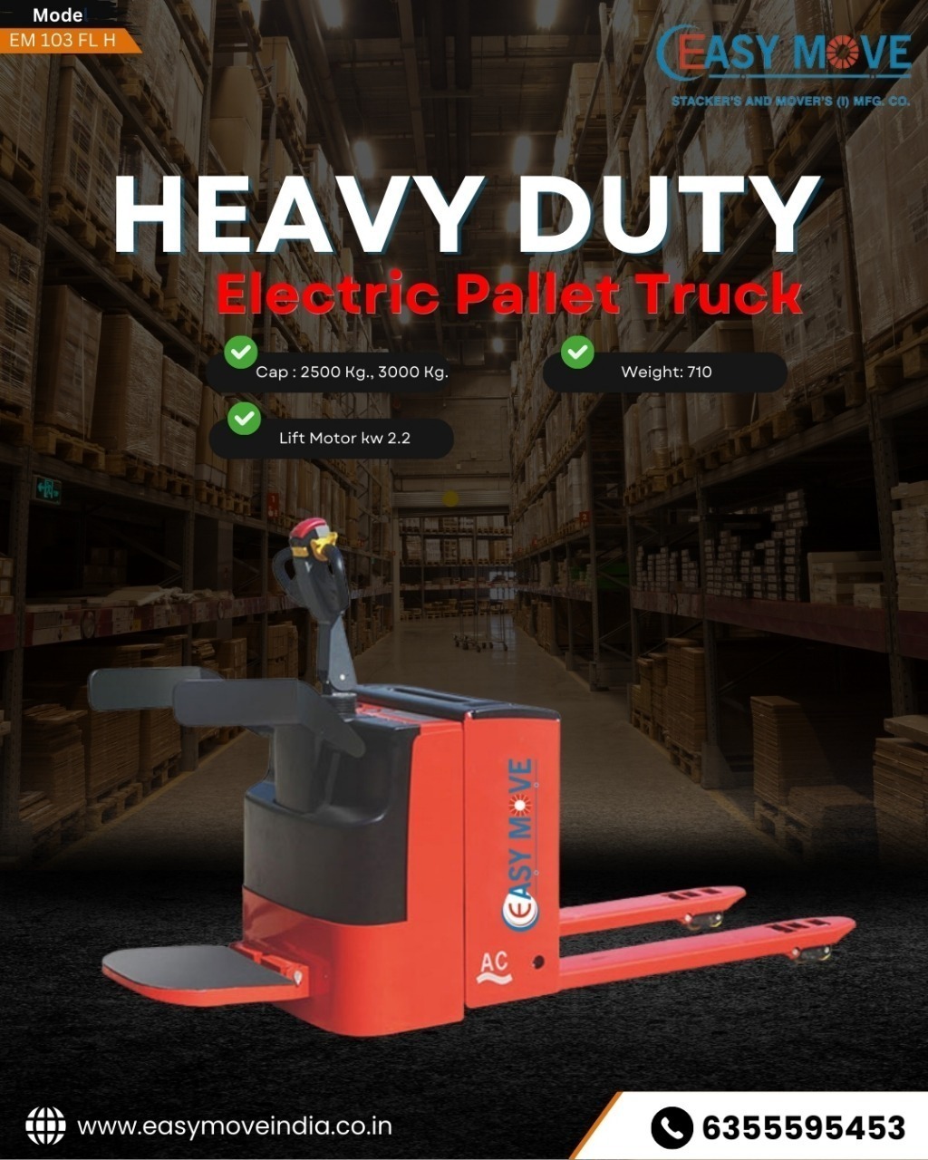 Easy Move is a leading Heavy Duty Electric Pallet Truck Manufacturer in Ahmedabad, Gujarat, India, delivering advanced material handling solutions designed to improve efficiency, safety, and productivity across industries. Our heavy-duty electric pallet trucks are built for high-capacity performance, smooth maneuverability, and reliable operation in demanding industrial environments.
