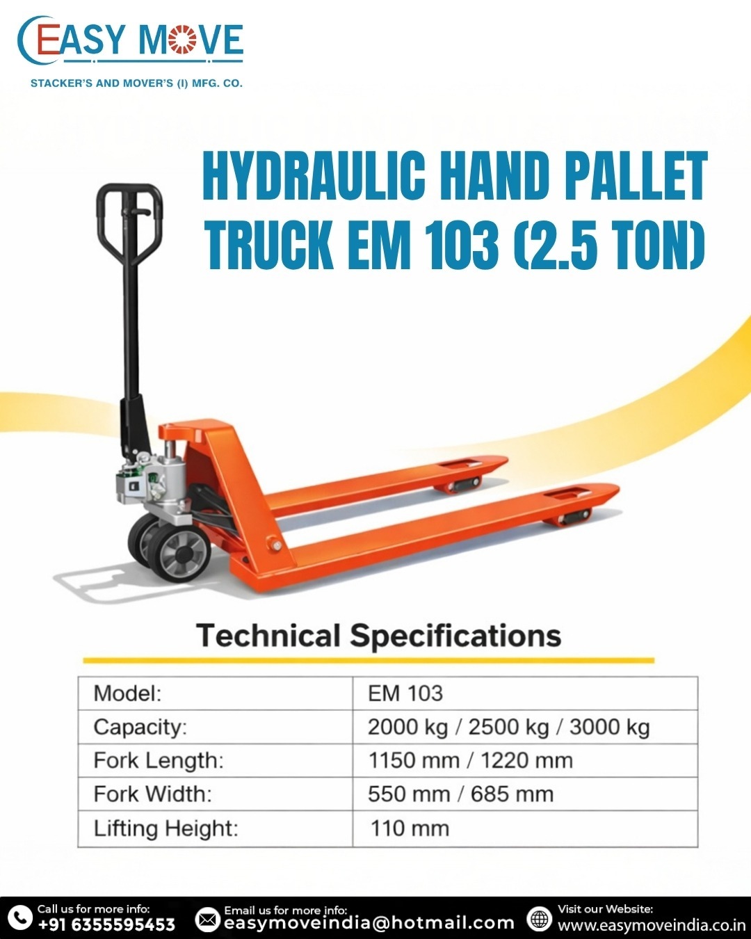 A 2.5 Ton Hydraulic Hand Pallet Truck is a robust, efficient manual material-handling solution for lifting and transporting heavy palletised loads in warehouses, factories, and retail spaces. As a trusted Hydraulic Hand Pallet Truck Manufacturer in Ahmedabad, EasyMove offers high-performance pallet trucks built for durability, ease of use, and long-term reliability.