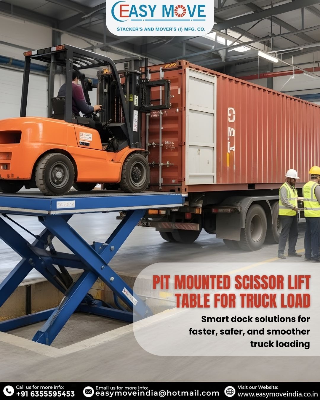 Recognized as a trusted Pit-Mounted Scissor Lift Table Supplier in India and reliable Pit-Mounted Scissor Lift Table Dealer in Gujarat, Easy Move delivers durable, safe, and customized lifting solutions for industrial applications.
