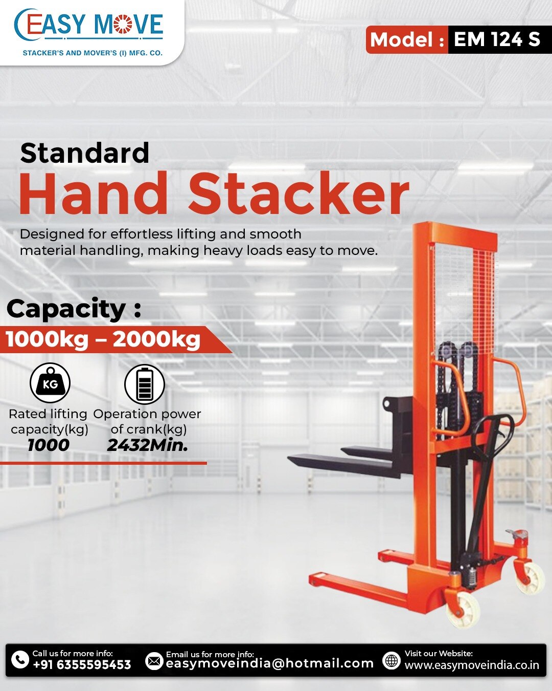Our Standard Hand Stacker range is available in two robust models – EM 124 S and EM 124 L – engineered to handle heavy loads with ease while ensuring smooth and controlled operations. These stackers are ideal for material handling, lifting, and stacking applications across manufacturing units, warehouses, logistics, and retail storage facilities.