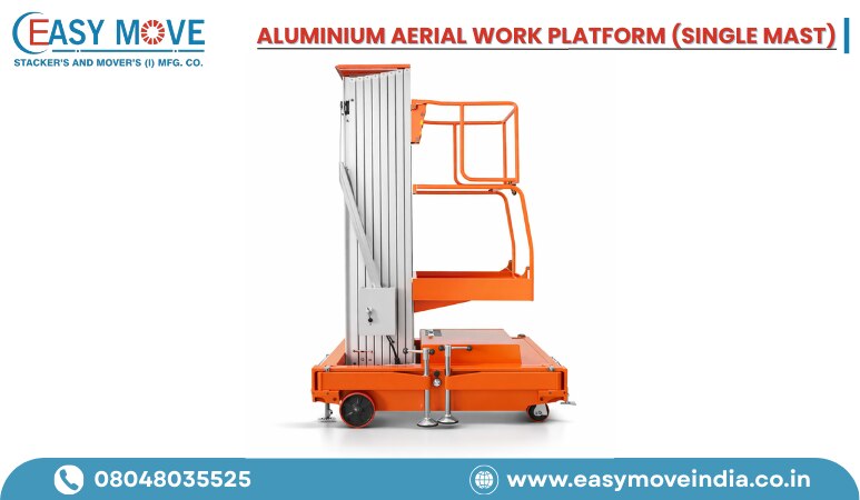 Aluminum Aerial Work Platform (Double Mast) Manufacturer in India. Working at height requires precision, safety, and equipment that can be trusted in every lift. At STACKER'S & MOVER'S Co. Ltd., we design and manufacture aluminum aerial work platforms (single mast) that combine lightweight mobility with industrial-grade strength. Ideal for maintenance, warehousing, and facility operations, our platforms simplify elevated work while ensuring maximum operator protection. Technical Details • Lift Capacity: Supports up to 150 kg • Available Heights: 4 m, 6 m, 8 m, and 10m • Material: Lightweight corrosion-resistant aluminium • Mobility: Compact footprint with smooth-rolling wheels • Operation: Powered through DC battery or standard AC line • Stability: Balanced base with anti-tilt safeguards • Safety: Non-slip platform and emergency stop features What Makes Us Stand Out As a trusted aluminum aerial work platform manufacturer in Ahmedabad, STACKER'S & MOVER'S Co. Ltd. offers: • Tailored height and load configurations • Fast production and delivery timelines • Field-tested safety and durability • Competitive pricing with zero compromise on quality • Dedicated support team for service and guidance Comprehensive Services • Product customization as per height and load requirements • On-site demonstrations and training • Preventive maintenance and AMC support • Spare parts availability across India Contact Stacker's & Mover's Co. Ltd. today.