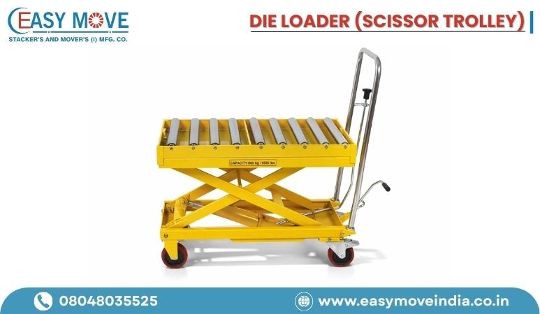 Die Loader Scissor Trolley Manufacturer in India. When it comes to material handling equipment, a die loader scissor trolley plays a crucial role in lifting and transporting heavy loads with ease. At Easy Move, we specialize in manufacturing top-quality trolleys designed to enhance workplace efficiency and safety. Our solutions cater to a wide range of industries, ensuring seamless operations with minimal effort. Why Choose Our Die Loader Scissor Trolley? As a leading die loader scissor trolley manufacturer from India, we offer: 1. High Load Capacity & Sturdy Design Our trolleys are built to handle loads up to 500 kg, making them perfect for industrial applications. The robust construction ensures durability, even in demanding environments. 2. Smooth & Efficient Lifting Mechanism With a maximum lifting height of 1000 mm, our scissor trolleys provide effortless lifting and precise control, reducing manual strain and increasing productivity. 3. Customizable Dimensions We manufacture trolleys with table dimensions that meet customer-specific requirements, ensuring a perfect fit for diverse applications. 4. Easy Mobility with Durable Caster Wheels Equipped with 100 x 25 mm caster wheels, our die loaders ensure smooth movement and easy maneuverability across different surfaces. Technical Specifications • Model: EM-109 D • Capacity: 500 kg • Min. Table Height: 300 mm • Max. Table Height: 1000 mm • Table Dimensions: As per customer requirements • Caster Wheels: 100 x 25 mm Applications of Die Loader Scissor Trolley Our die loaders are ideal for various industries, including: • Manufacturing Units: Efficient handling of heavy dies and tools. • Warehouses: Streamlined material transportation. • Automobile Industry: Lifting and moving vehicle parts. • Printing & Packaging: Safe handling of paper rolls and packaging materials. Call us for more information.