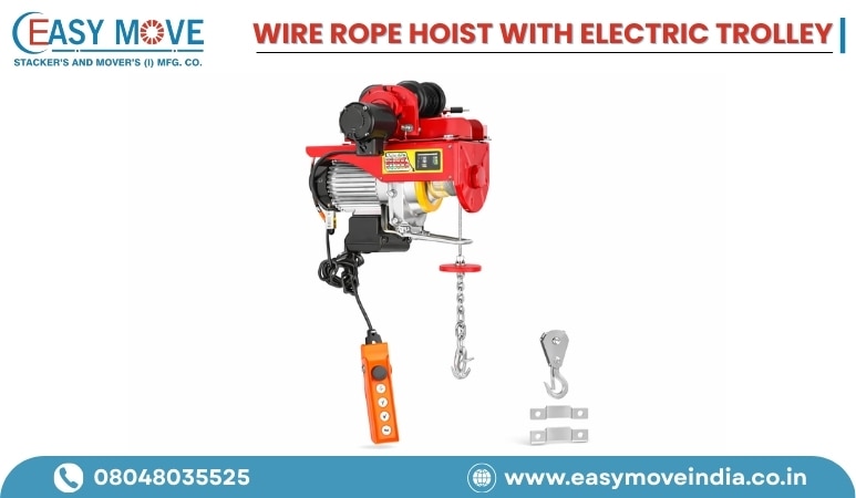 Wire Rope Hoist With Electric Trolley Manufacturer in India. For industries requiring efficient and safe lifting solutions, a reliable wire rope hoist with an electric trolley is essential. Easy Move, a trusted electric wire rope hoist manufacturer in Gujarat, offers high-performance hoists built to meet the demands of various industries, including warehouses, construction, and manufacturing units. Why Choose Easy Move? As a leading electric wire rope hoist manufacturer from India, Easy Move ensures: • Superior Lifting Performance—Smooth and powerful lifting with high load capacity. • Electric Trolley Integration—Enhanced movement for precise material handling. • Robust Build Quality—Made from alloy steel, A3 steel, and copper for long-lasting durability. • Advanced Safety Features—Equipped with a reliable braking system and overload protection. • Energy-Efficient Operation—Reduces power consumption while maximizing efficiency. Technical Specifications Our electric wire rope hoist with electric trolley in Ahmedabad is engineered with precision to provide high performance and reliability. Product Details: • Brand: Easy Move • Lifting Capacity: 250 kg (Single Line), 550lb • Power: 1000W • Material: Alloy Steel, A3 Steel, Copper • Method of Use: Single Line and Double Line • Lifting Speed: o Single Line: 12 m/min o Double Line: 6 m/min • Lifting Height: o Single Line: 12m (40ft) o Double Line: 6m (20ft) • Diameter of Cable: 4 mm (0.157 inch) • Net Weight: 16.3kg (36lb) • Starting Capacitor: 30uf • Install Size: 22.5x10cm (8.85×3.93inch) Applications of Electric Wire Rope Hoist Our hoists are ideal for various industrial applications, including: • Warehouses—Efficiently lifting and moving heavy loads. • Construction Sites—Safe and powerful lifting of materials. • Manufacturing Units—Smooth and precise handling of machinery components. • Auto Shops & Garages—Overhead lifting for vehicle parts and repairs. Our Core Services At Easy Move, we offer comprehensive lifting solutions, including: • Custom-built wire rope hoists tailored to specific industrial needs. • Professional consultation for selecting the right hoist. • Installation, setup, and training support. • Reliable after-sales service and maintenance. Customer Benefits Choosing Easy Move for your lifting needs provides: • Higher Efficiency—Reduced labor efforts with an electric trolley system. • Cost Savings—Energy-efficient technology lowers operational costs. • Long-Term Durability—Strong build quality ensuring longevity. • User-Friendly Controls—Simple operation for seamless lifting. Call us for more information.